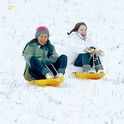 Yoona Imyoona and a friend joyfully sled down a snow-covered hill, laughing and having winter fun.