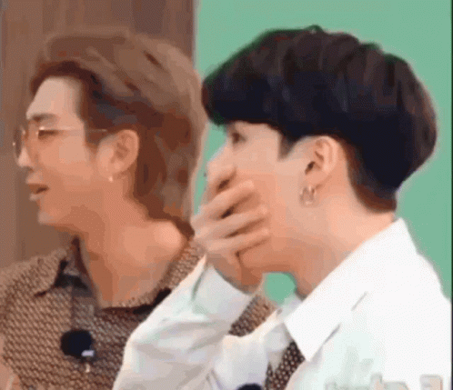 Yoongi (Suga) from BTS reacts with a shocked expression, covering his mouth with his hand.