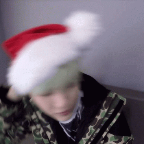 Yoongi wearing a festive Santa hat and a camouflage jacket, captured in a blurry, playful moment.