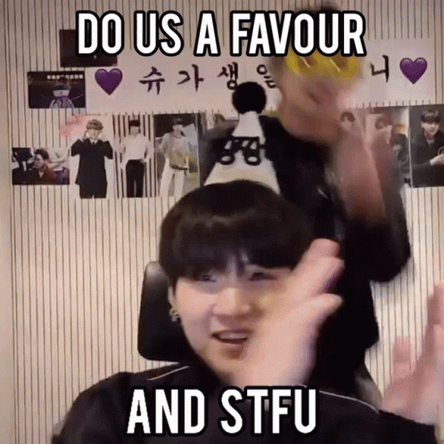 Yoongi (Suga) and Jungkook from BTS in a playful moment with a 'Do Us a Favor and STFU' meme caption.
