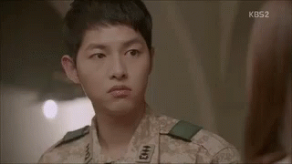 Song Joong-ki as Captain Yoo Si-jin from Descendants of the Sun, looking intently in his military uniform.