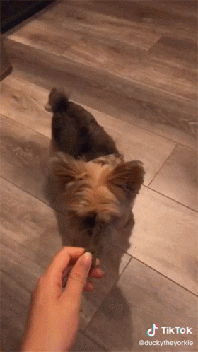 A person feeds Ducky the Yorkie a treat, who gently takes it from their hand on a wooden floor.