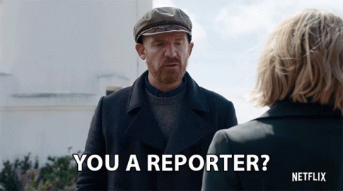 Wallace Faulkner, played by Marc Evan Jackson, confronts a woman, asking 'You a reporter?'