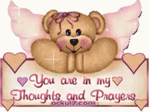 A teddy bear with angel wings sits on a sign reading 'You Are In My Thoughts And Prayers', surrounded by sparkles.