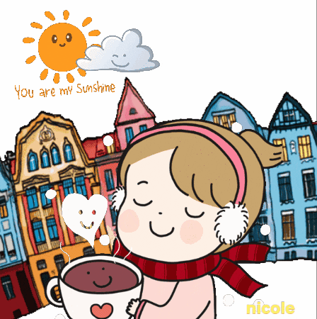 A sweet cartoon girl enjoys a warm cup of coffee in a snowy town, with the sun and a cloud smiling above her, proclaiming 'You are my Sunshine'.