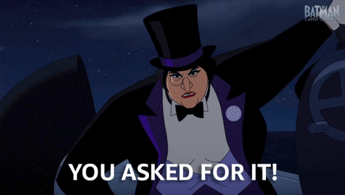 The Penguin from Batman: Caped Crusader delivers a stern 'You Asked For It!' with a menacing look.