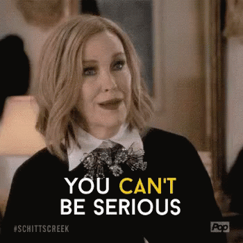 Moira Rose from Schitt's Creek reacts with disbelief, saying 'You can't be serious'.