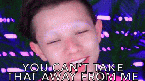Clawdeena smiles and headshakes with the text 'YOU CAN'T TAKE THAT AWAY FROM ME' against a neon background.