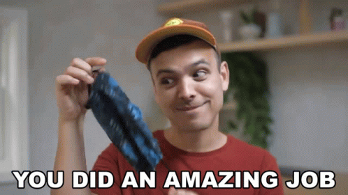 Mitchell Moffit holds up an item, smiling, with the encouraging message 'You Did An Amazing Job' displayed.