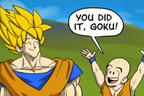 Krillin celebrates Goku's achievement with a cheerful 'You Did It, Goku!' in this animated scene.