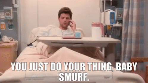 Man in hospital bed on phone, saying 'You just do your thing, baby smurf.'