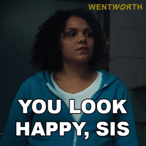 A woman from the series Wentworth, wearing a blue hoodie, delivers the line 'You look happy, sis'.