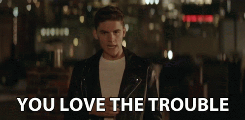 Ryland James, wearing a leather jacket, sings with the text 'YOU LOVE THE TROUBLE' overlaid on screen.