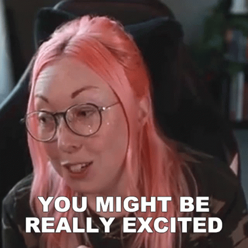 Ashni, a woman with vibrant pink hair and stylish glasses, excitedly delivers the line 'YOU MIGHT BE REALLY EXCITED'.