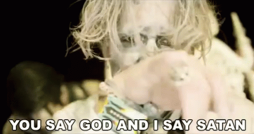 Marilyn Manson screams the lyrics 'You Say God And I Say Satan' in a music video, featuring his iconic face paint.
