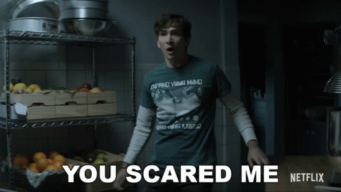 Dylan Arnold as Theo reacts with a startled expression in a kitchen, exclaiming 'You Scared Me' from the Netflix series.