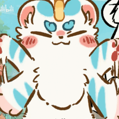 An animated cat-like creature from You Shou Yan's Fabulous Beasts, featuring hearts and a joyful expression.