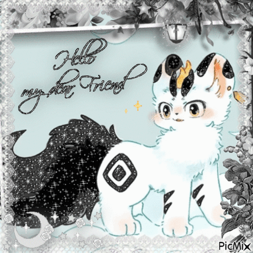 Cute You Shou Yan Qishiqi character on a glittery greeting card with 'Hello my dear Friend' text.