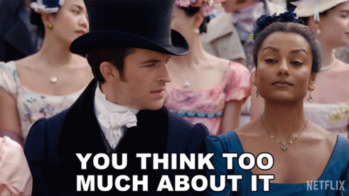 Lord Anthony Bridgerton and Kate Sharma in a scene from Bridgerton, with the caption 'You Think Too Much About It'.