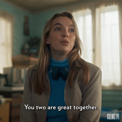 Jodie Comer as Villanelle delivers a sarcastic 'You two are great together' with a wry smile.