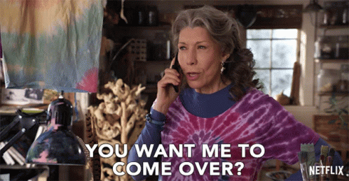 Lily Tomlin as Frankie, in a tie-dye shirt, on the phone asking, 'You want me to come over?' from Grace and Frankie.