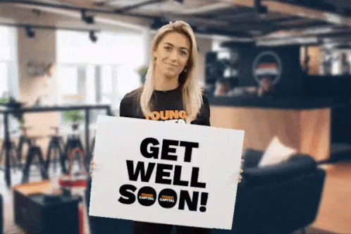 A woman holds up a 'Get Well Soon!' sign with the Young Capital logo, smiling brightly.