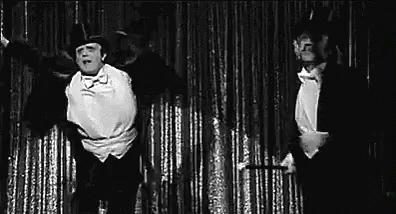 An iconic comedic dance scene from Young Frankenstein, featuring two men in tuxedos and top hats performing on stage.