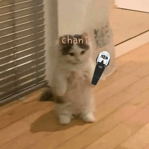 A cute cat stands on its hind legs, holding an SF9 light stick, featuring names like Youngbin, Dawon, and Taeyang.
