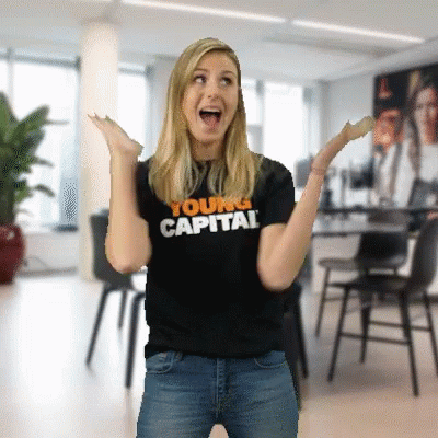 Woman in a Youngcapital shirt reacts with an excited 'OMG' expression, throwing her hands up.