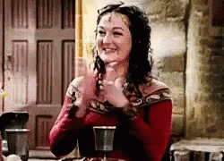 Woman from Kaamelott joyfully exclaims 'Youpi!' with a big smile and clapping hands.