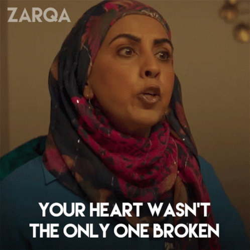 Zarqa Nawaz delivers a poignant line, 'Your heart wasn't the only one broken,' wearing a patterned hijab.