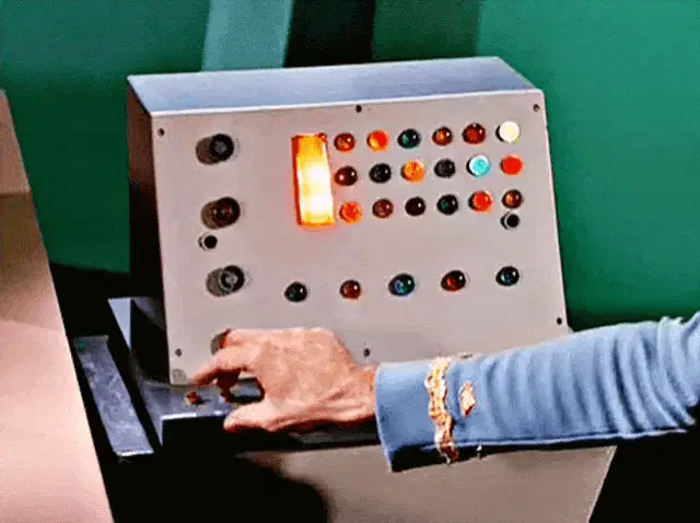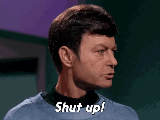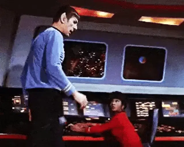 Captain Kirk, portrayed by William Shatner, delivers the iconic line 'You're beautiful' in a close-up.