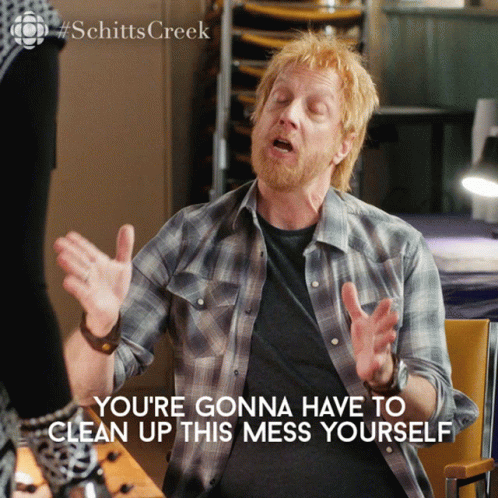Roland Schitt, played by Chris Elliot, tells someone 'You're gonna have to clean up this mess yourself' in Schitt's Creek.