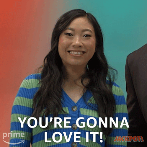 Katie enthusiastically declares 'You're gonna love it!' while wearing a blue and green striped cardigan for Prime Jackpot.