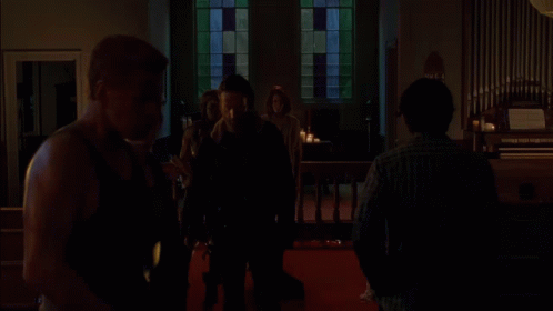 Rick Grimes confronts another character in a church, with the text "YOU'RE NOT TAKING THE BUS" appearing.