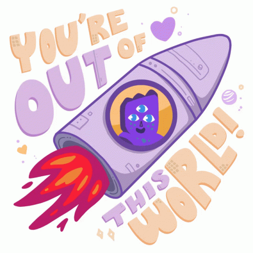 Animated purple rocket with a three-eyed alien, expressing 'You're Out Of This World! You're Amazing'.
