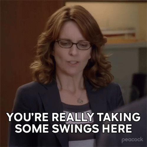 Tina Fey as Liz Lemon delivers the line 'You're really taking some swings here' in a memorable moment from 30 Rock.