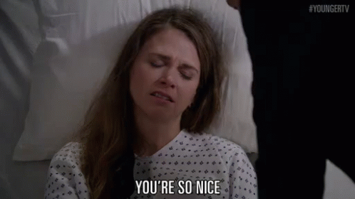 Liza Miller, portrayed by Sutton Foster, lies in a hospital bed, expressing gratitude with 'You're so nice'.