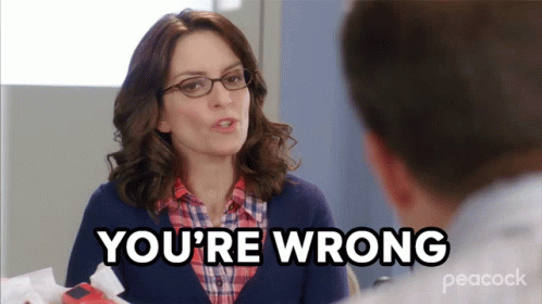 Liz Lemon, played by Tina Fey, emphatically states 'You're Wrong' to someone off-screen.