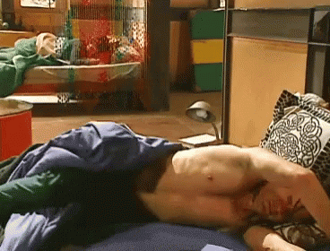 Ricardo Fernandez, shirtless, lies on a bed with a blue blanket, appearing tired and stiff.