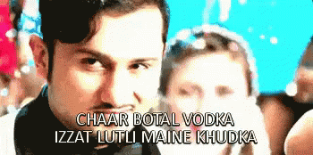 Yoyo Honey Singh in a tuxedo, with lyrics from his song 'Chaar Botal Vodka' displayed on screen.