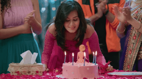 Mishti (Rhea Sharma) celebrates her birthday, blowing out candles on a pink cake surrounded by friends.
