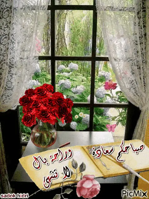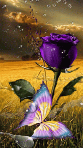 A beautiful red rose and a colorful butterfly in a golden wheat field, with floating bubbles.