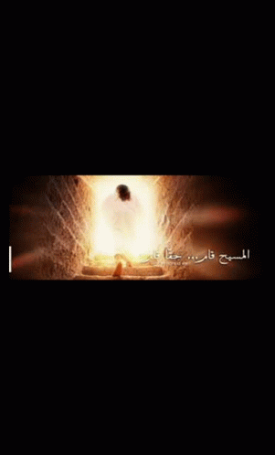 Jesus emerges from the tomb in a radiant light, with the Arabic caption 'Christ is risen... He is truly risen'.