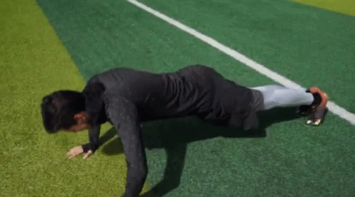 Bashar Arabi performs push-up exercises on a green artificial turf field, demonstrating fitness.