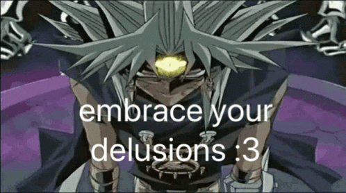 Yami Marik from Yu-Gi-Oh! with the text 'embrace your delusions :3' on screen.