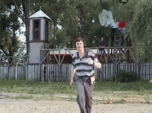 Man in striped shirt performs an energetic Yugo Synth dance, with the synth beat intensifying.
