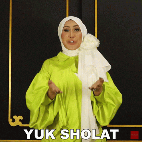 Ratu Meta encourages viewers to pray, saying 'Yuk Sholat' while wearing a green dress and white hijab.