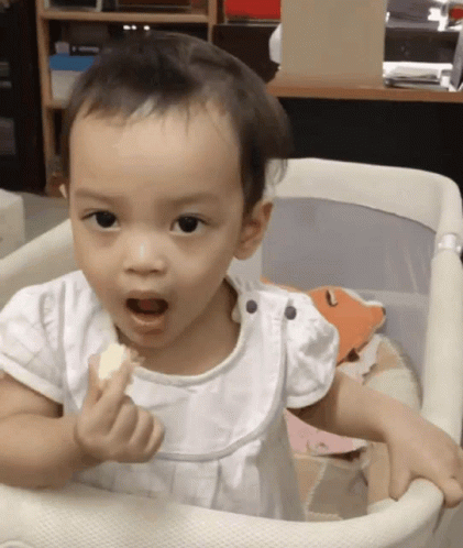 ฟัรซานา enjoys a yummy snack while sitting in her crib.