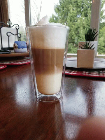 A beautifully layered coffee drink, possibly a latte or macchiato, in a clear glass on a wooden table.